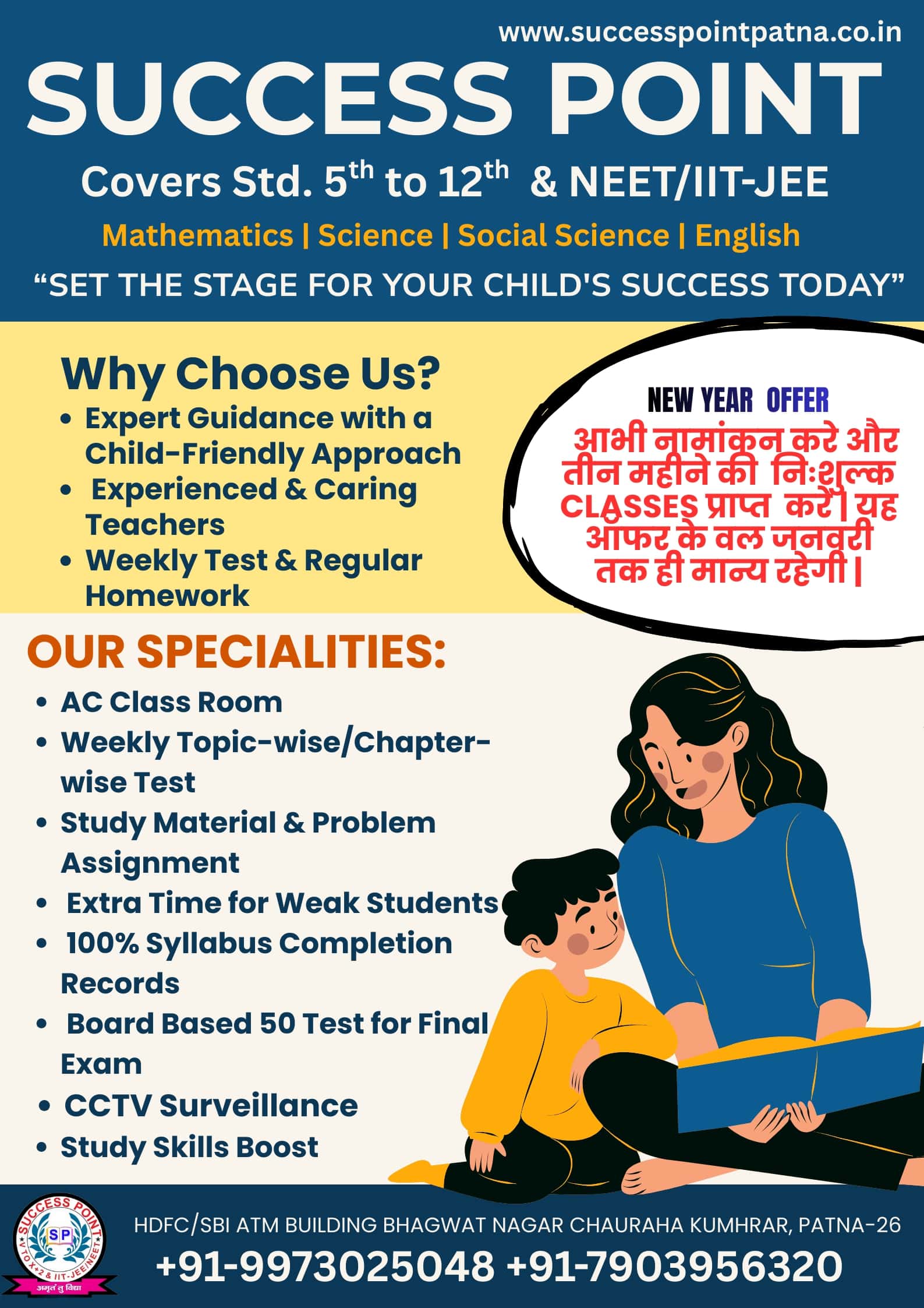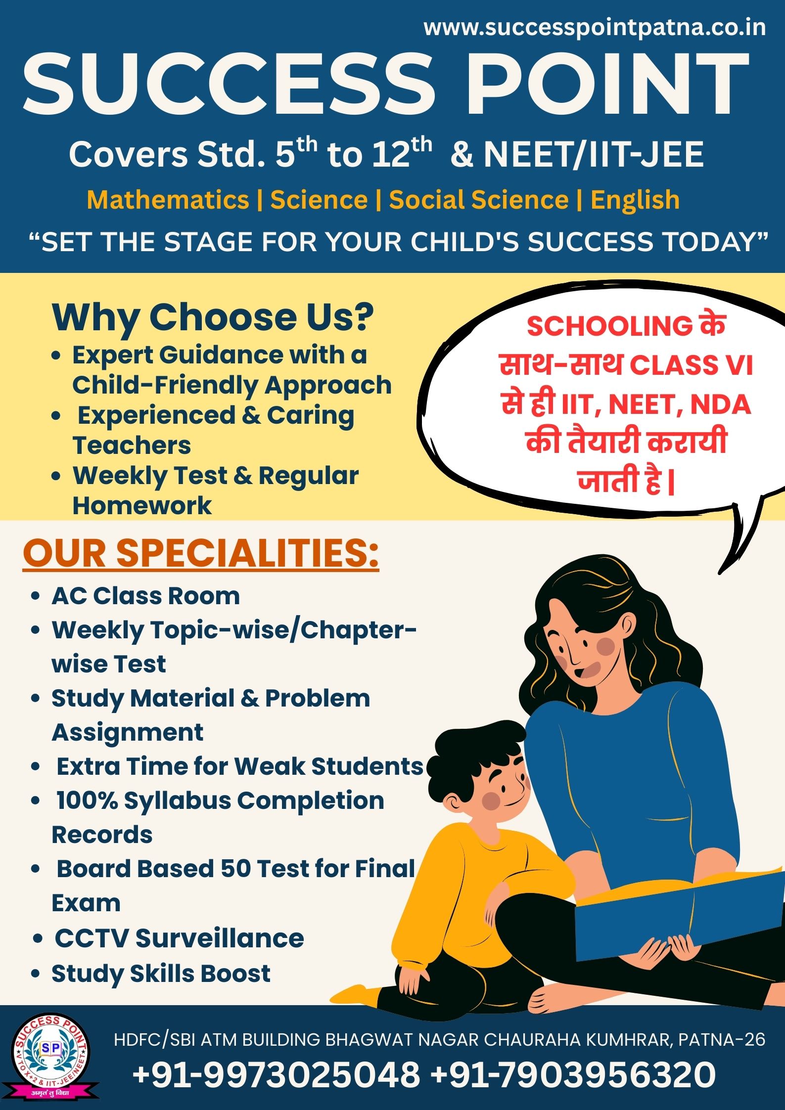 Success Point is the best, top 10, No 1, 9th and 10th Coaching, ICSE Board Coaching, 6th To 10th Coaching Classes, Maths Coaching, Physics Coaching, Chemistry Coaching, Biology Tuition, IIT JEE Exam Coaching, 11th Science Coaching, 12th Science Coaching, JEE Main Exam Coaching, JEE Advanced Exam Coaching, CBSE Board Coaching, Chemistry Classes, Mathematics Classes, Bihar Board Coaching in Kumhrar, Patna.